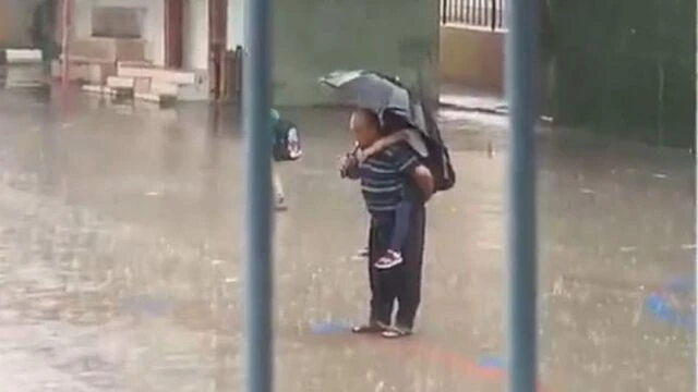 Baba yağışın altında nəvəsini kürəyinə alıb birlikdə İstiqlal Marşını oxudu