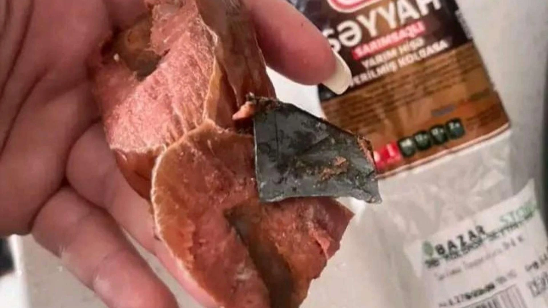 Kolbasanın içindən dəmir parçası çıxdığını əks etdirən foto sosial şəbəkələrdə yayılıb. Vətəndaş marketdən aldığı kolbasanın içindən dəmir parçası çıxdığı barədə sosial şəbəkədə paylaşım edib: "Bu gün səhər yeməyində kolbasa kəsirdim, gördüm ki, bıçaq nəyəsə dirəndi. Baxanda gördüm dəmir parçasıdır. SAB-ın kolbasasıdır. Allah lənət eləsin, bunu bu şəraitdə istehsal edən insanlara. Almayın, övladlarınıza verməyin! Görün, bizim kolbasalar hansı şəraitdə, necə iyrənc vəziyyətdə ərsəyə gəlir", – deyə vətəndaş paylaşımda qeyd edib.