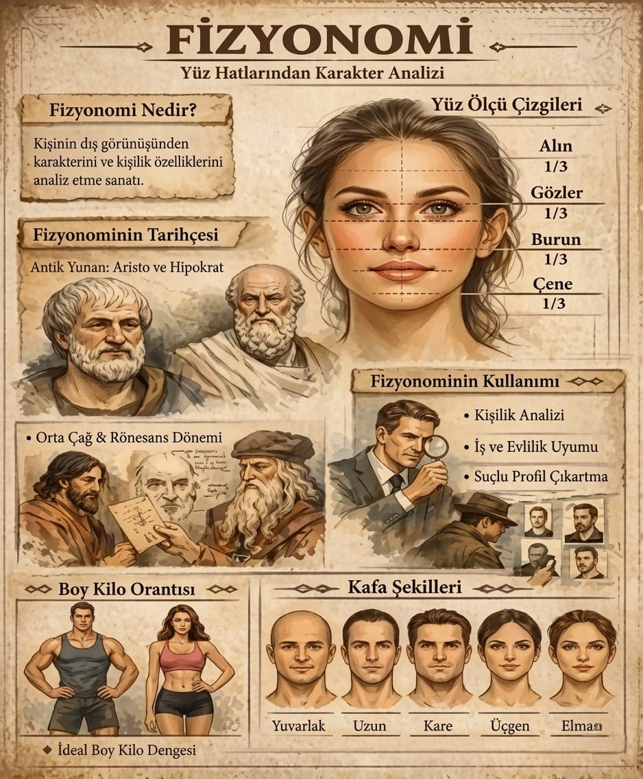 -Fizionomiya əsasən üz və əldən insanların xarakterinin oxunmasına əsaslanan 3000 illik elm və eyni zamanda bir sənətdir. Xüsusilə qədim Çin, Hindistan, Tibet, Osmanlı dövründə türklərdə və Qərb dünyasında bir çox ölkədə geniş şəkildə istifadə olunub. Ərzurumlu İbrahim Hakkı Əfəndi Türkiyədə bu sahənin “Marifətnamə” əsəri ilə öncüllərindən hesab olunur. Qərbdə isə Aristotel, Hippokrat, Ernst Kreçmer və İohan Kaspar Lavater bu istiqamətdə apardıqları işlərlə diqqət çəkiblər.