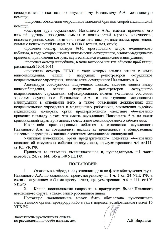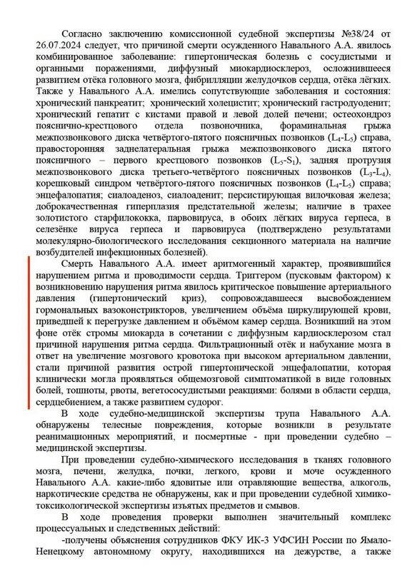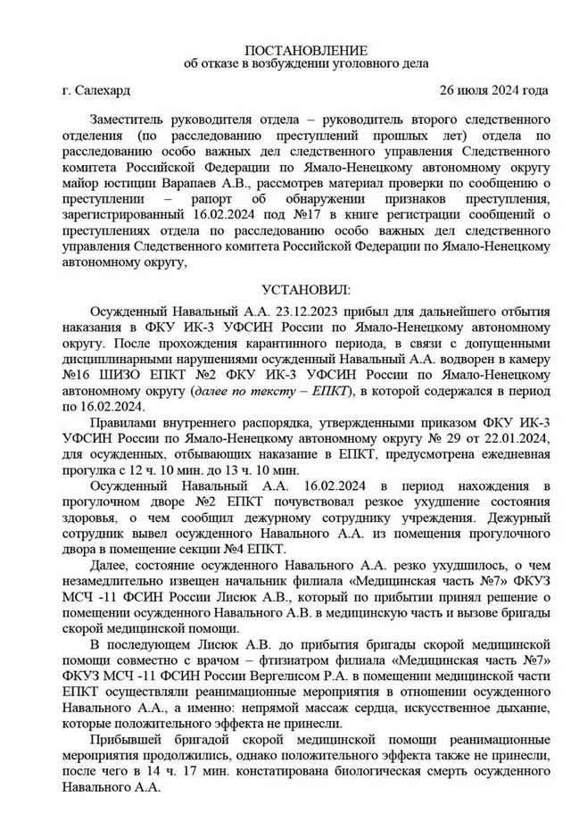 Qətnamədə Navalnının ölümünün cinayət xarakterli olmadığı və siyasətçinin bədənində aşkarlanan xəsarətlərin onun reanimasiya cəhdləri ilə əlaqəli olduğu vurğulanıb.