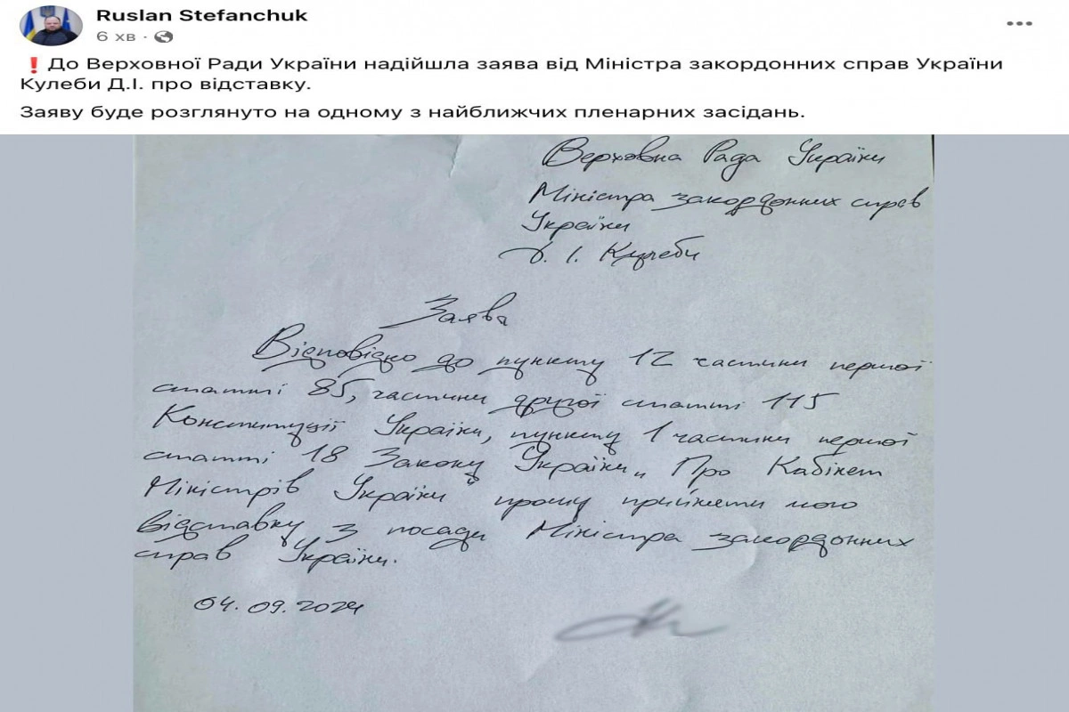Ruslan Stefançuk Dmitri Kulebanın istefa ərizəsinin fotosunu paylaşıb. Kuleba istefa ərizəsini Ali Radaya təqdim edib.