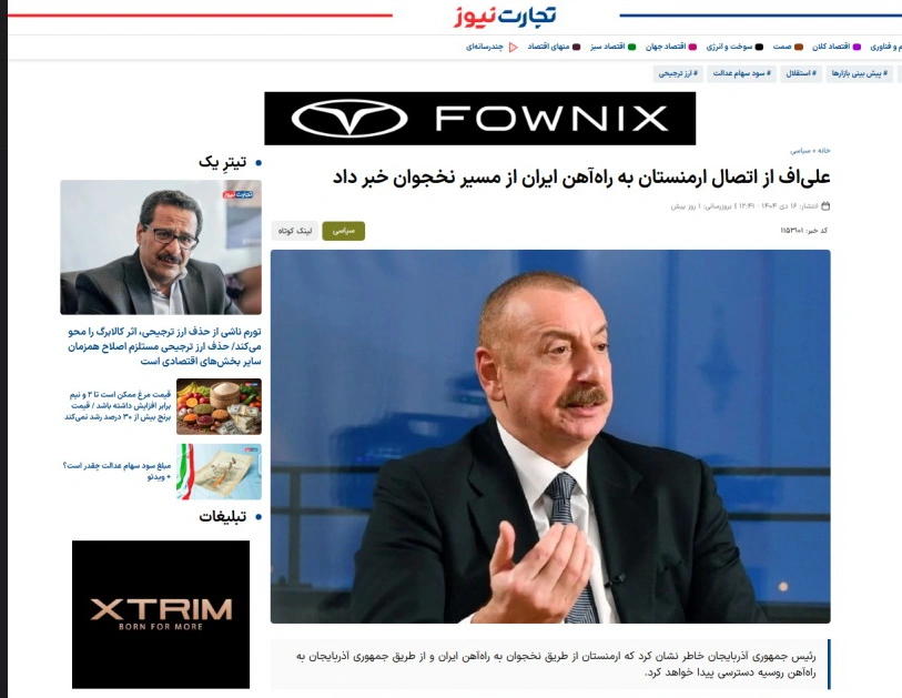 İranın IRNA dövlət agentliyinin, ISNA xəbər agentliyinin saytlarında, “Ğatreh”, “Tahlil Bazar”, “Tejaratnews” xəbər portallarında dərc olunmuş “Prezident Əliyev Ermənistanın Naxçıvan marşrutu ilə İran dəmir yoluna qoşulacağını bəyan edib” sərlövhəli məqalələrdə Azərbaycanın dövlət başçısının Ermənistanın Naxçıvan vasitəsilə İran dəmir yoluna, Azərbaycan Respublikası vasitəsilə isə Rusiya dəmir yoluna çıxış əldə edəcəyi barədə fikirləri yer alıb. Materiallarda vurğulanır ki, Prezident İlham Əliyev Ermənistan sərhədinə gedən həm dəmir yolunun, həm avtomobil yolunun tezliklə hazır olacağını bildirib. Azərbaycan lideri əlavə edib ki, bu layihə tam başa çatandan sonra onun yükötürmə qabiliyyəti 15 milyon tona bərabər olacaq, həm Şərq-Qərb, həm də ki, Şərq-Cənub, bəlkə də Şimal-Cənub yolunun bir qolu olacaq. Dövlət başçısı əlavə edib: “Çünki bu gün Şimal-Cənub layihəsi deyəndə, ilk növbədə, Rusiya-Azərbaycan-İran, yəni Rəşt-Astara yolu nəzərdə tutulur. Bu yol da vacibdir. Ancaq Zəngəzur dəhlizi açılandan sonra sovet vaxtı mövcud olmuş Sovet İttifaqı-İran yolu yenə də bərpa ediləcək. Yəni ki, Rusiya-Bakı-Ağbənd-Ermənistan-Naxçıvan-Culfa-Fars körfəzi – bu, Şimal-Cənub marşrutunun ikinci yolu olacaq”.