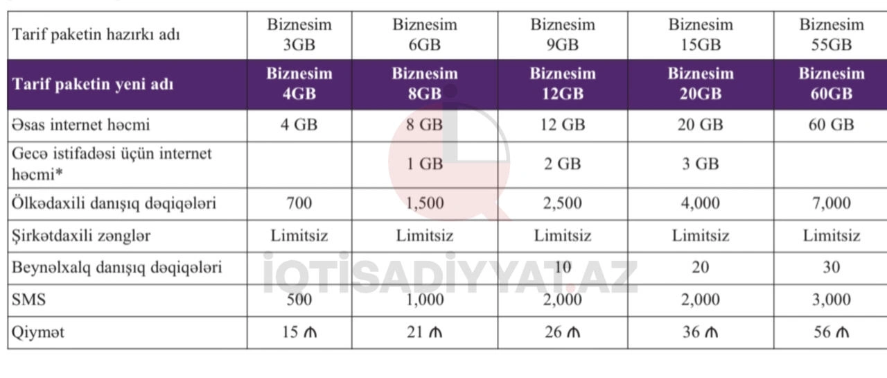 Belə ki, fevralın 25-dən sonra "Biznesim 3GB" tarifi "Biznesim 4GB", "Biznesim 6GB" tarifi "Biznesim 8GB", "Biznesim 9GB" tarifi "Biznesim 12GB", "Biznesim 15GB" tarifi "Biznesim 20GB" və "Biznesim 55GB" tarifi "Biznesim 60GB" adlanacaq.