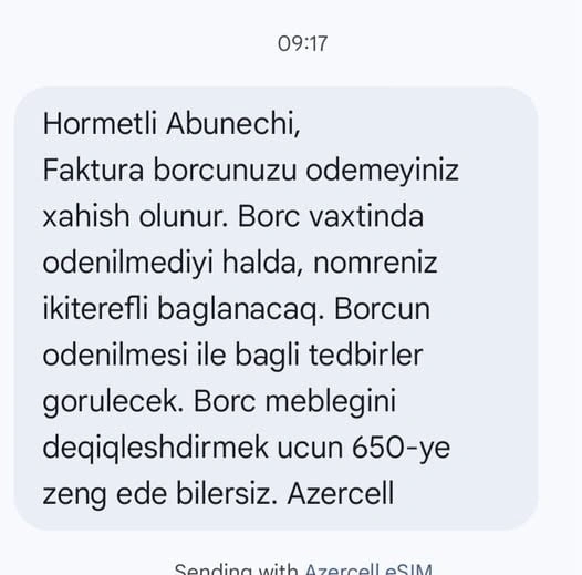 “Hörmətli abunəçi. Faktura borcunuzu ödəməyiniz xahiş olunur. Borc vaxtında ödənilmədiyi halda nömrəniz ikitərəfli bağlanacaq. Borcun ödənilməsi ilə bağlı tədbirlər görüləcək (?! – M.R.).”