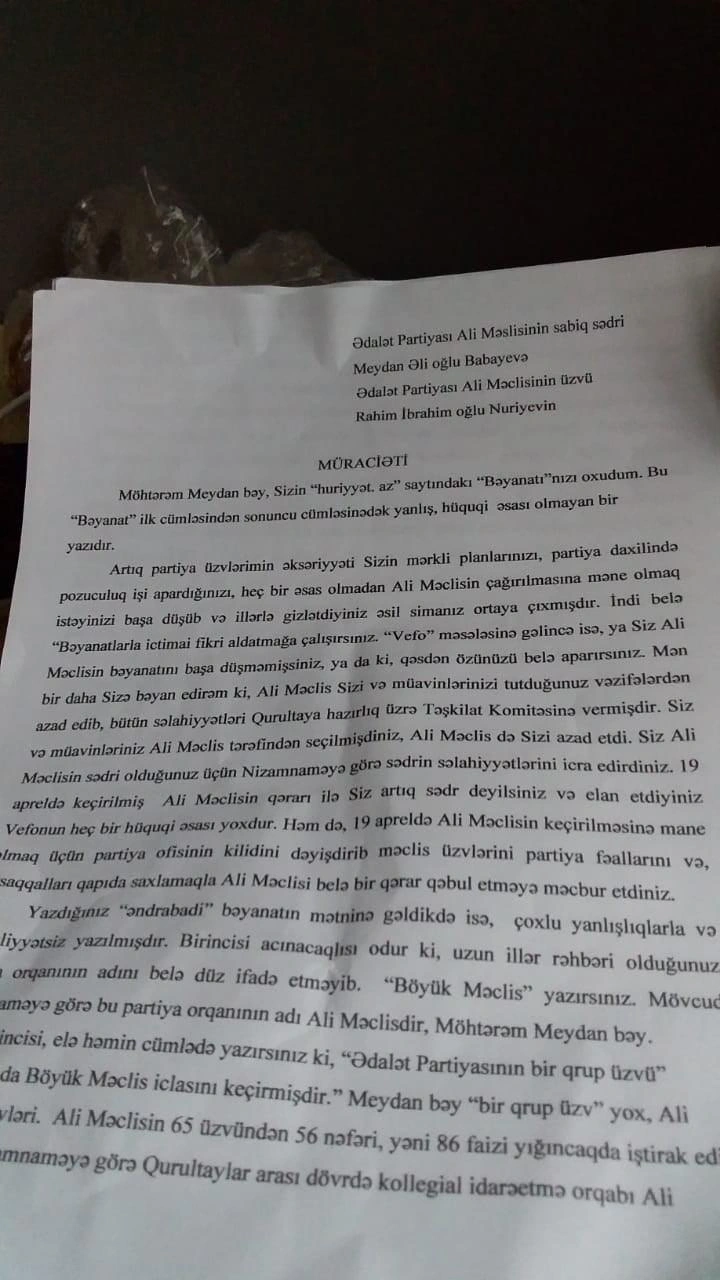 Ədalət Partiyası Ali Məclis və Təşkilat Komitəsinin üzvü Rahim Nuriyev Partiyanın Ali Məclisinin sabiq sədri Meydan Əli oğlu Babayevə açıq məktubla müraciət edib.