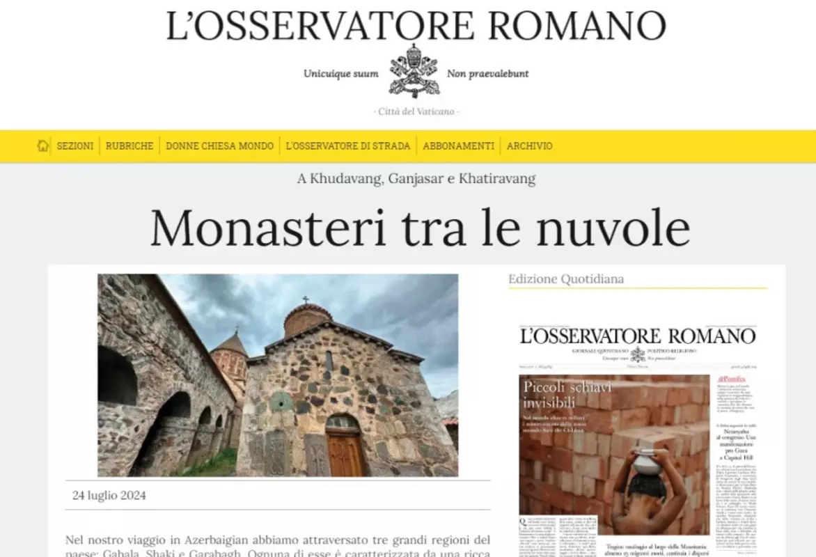 AZƏRTAC xəbər verir ki, qəzetin jurnalisti Rossella Fabianinin qələmə aldığı məqalədə Azərbaycanda Alban Apostol Kilsəsinin varisləri olan kilsələr, eləcə də Xudavəng, Gəncəsər və Xatirəvəng monastırlarının tarixindən, onlarla bağlı faktlardan və həqiqətlərdən söz açılır.