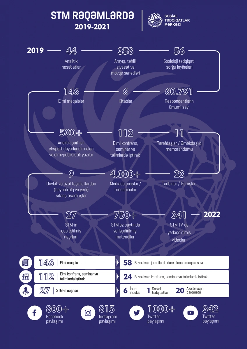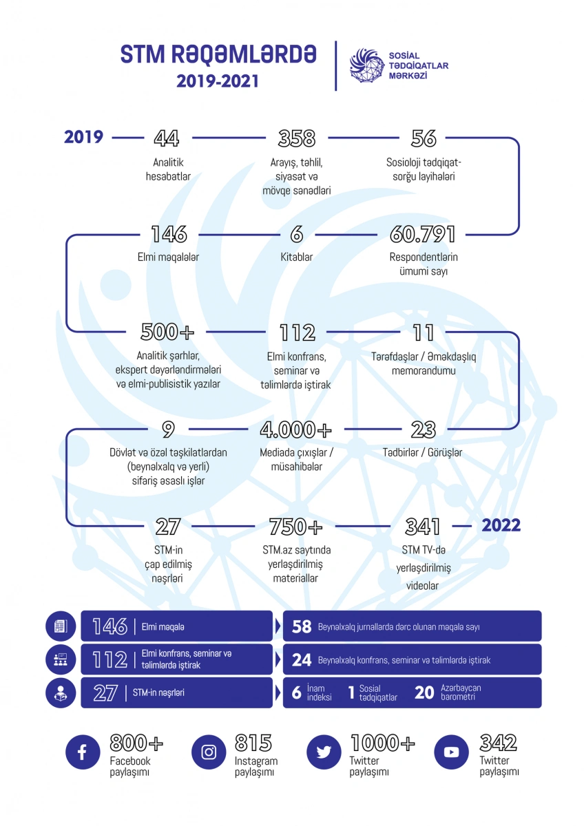 Mərkəzin 3 illik (2019-2021) fəaliyyəti ilə bağlı əsas göstəricilər, bu dövrdə əldə edilmiş nəticələr, 2022-ci və növbəti illər üçün əsas strateji istiqamətlər və hədəflər daha ətraflı “Sosial Tədqiqatlar Mərkəzi 3 ildə” hesabatında öz əksini tapıb.