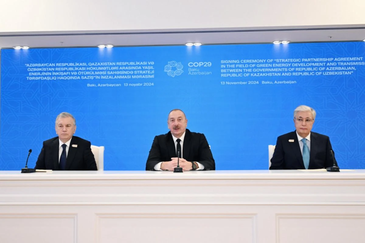 Dünən konfransdakı çıxışımda Azərbaycandan Qara dənizin dibi ilə Avropaya kabel xətti çəkməsi ilə bağlı ölkəmizin artıq həyata keçirilməkdə olan planlarından danışdım. Bu layihənin texniki-iqtisadi əsaslandırılması tamamlanmaq üzrədir və bununla da biz Mərkəzi Asiyanı, Qafqazı, Avropanı, Xəzər və Qara dənizləri vahid enerji dəhlizi ilə birləşdirəcəyik. Xüsusilə sevindirici haldır ki, bu Saziş hər zaman bir-birinə yaxın olan üç qardaş ölkə arasında imzalanır. Özbəkistanla münasibətlərimiz bu il müttəfiqlik münasibətləri səviyyəsinə çatıb, müvafiq saziş imzalanıb. Qazaxıstanla artıq uzun müddətdir ki, strateji tərəfdaş kimi əməkdaşlıq edirik. Qarabağın bərpasında bizə ilk yardım edən ölkələr Özbəkistan və Qazaxıstandır. Füzulidə Mirzə Uluqbəy adına məktəb, Kurmanqazı adına yaradıcılıq mərkəzi bu gün qardaşlığımızın bariz sübutudur. Əminəm ki, biz gələcəkdə də həmişə bir yerdə olacağıq və bir-birimizi dəstəkləyəcəyik. Əziz dostlarım, qardaşlarım Şavkat Miromonoviçə, Kasım-Jomart Kemeleviçə COP29-da iştirak etdiklərinə və öz iştirakları və dəyərli fikirləri, mesajları ilə tədbirimizi zənginləşdirdiklərinə görə minnətdaram.