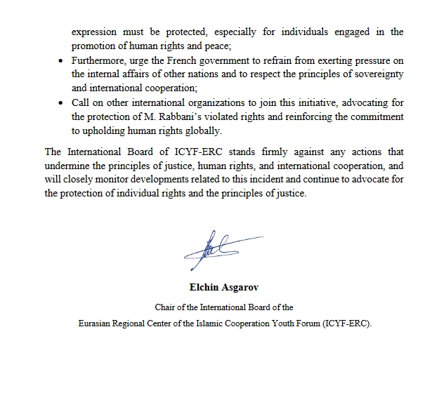 Bəyanatda Fransa hökumətinə bu hadisənin hərtərəfli araşdırılması, başqa dövlətlərin daxili işlərinə qarışmaması, suverenlik və beynəlxalq əməkdaşlıq prinsiplərinə hörmət edilməsi və belə halların gələcəkdə baş verməməsi, xüsusilə, insan haqlarının və sülhün qorunması sahəsində çalışan şəxslər uçun hərəkət və ifadə azadlığının təmin edilməsi ilə bağlı çağırış edilib.