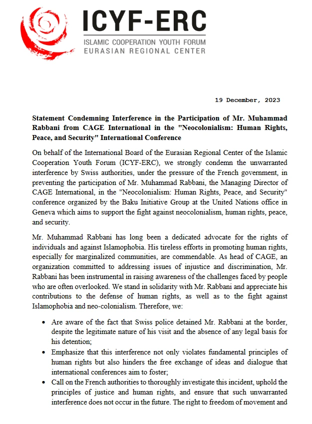 İslam Əməkdaşlıq Gənclər Forumu Avrasiya Regional Mərkəzi Britaniya vətəndaşı Məhəmməd Rəbbaninin Fransanın tələbi ilə BMT-nin Cenevrə ofisində Bakı Təşəbbüs Qrupunun təşkil etdiyi "Neokolonializm: İnsan Haqları, Sülh və Təhlükəsizlik" konfransına buraxılmamasını pisləyib.