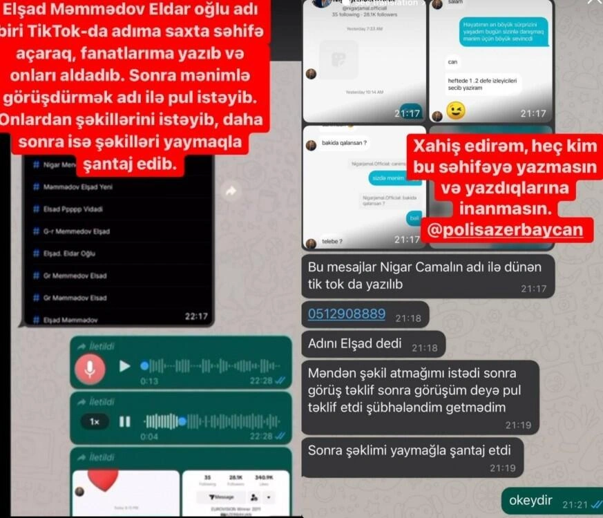 Qeyd edək ki, Elşən Məmmədov adlı şəxs TikTok-da səhifə açaraq Nigarın adından fanatlarına mesaj yazıb, onlardan foto istəyib. Daha sonra isə onları fotoları ilə şantaj edib, pul istəyib.