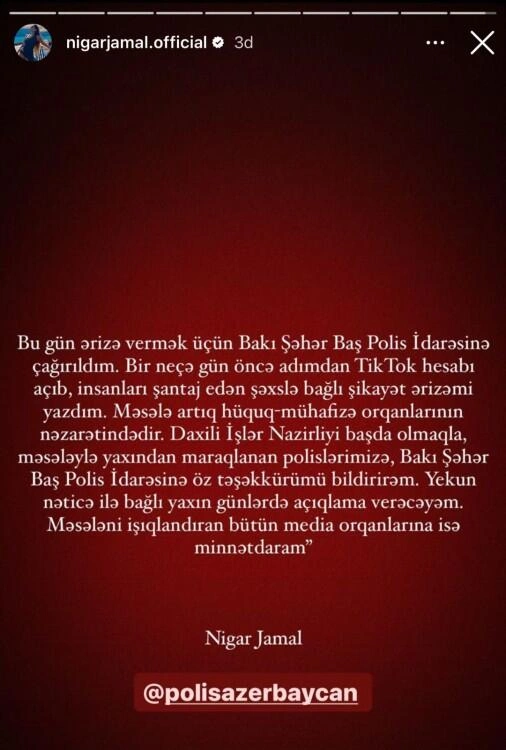 "Bu gün ərizə vermək üçün Bakı Şəhər Baş Polis İdarəsinə çağırıldım. Bir neçə gün öncə adımdan TikTok hesabı açıb, insanları şantaj edən şəxslə bağlı şikayət ərizəmi yazdım. Məsələ artıq hüquq-mühafizə orqanlarının nəzarətindədir. Daxili İşlər Nazirliyi başda olmaqla, məsələylə yaxından maraqlanan polislərimizə, Bakı Şəhər Baş Polis İdarəsinə təşəkkürümü bildirirəm. Yekun nəticə ilə bağlı yaxın günlərdə açıqlama verəcəyəm. Məsələni işıqlandıran bütün media orqanlarına isə minnətdaram".
