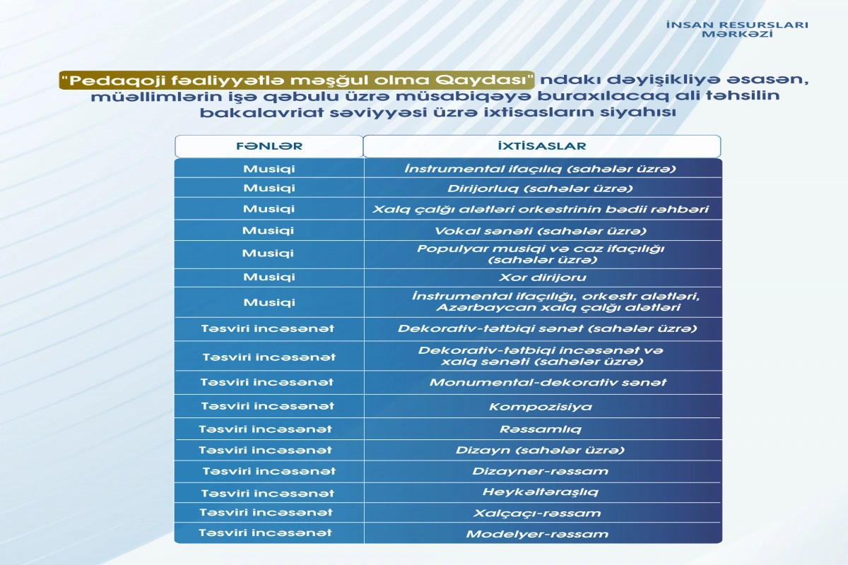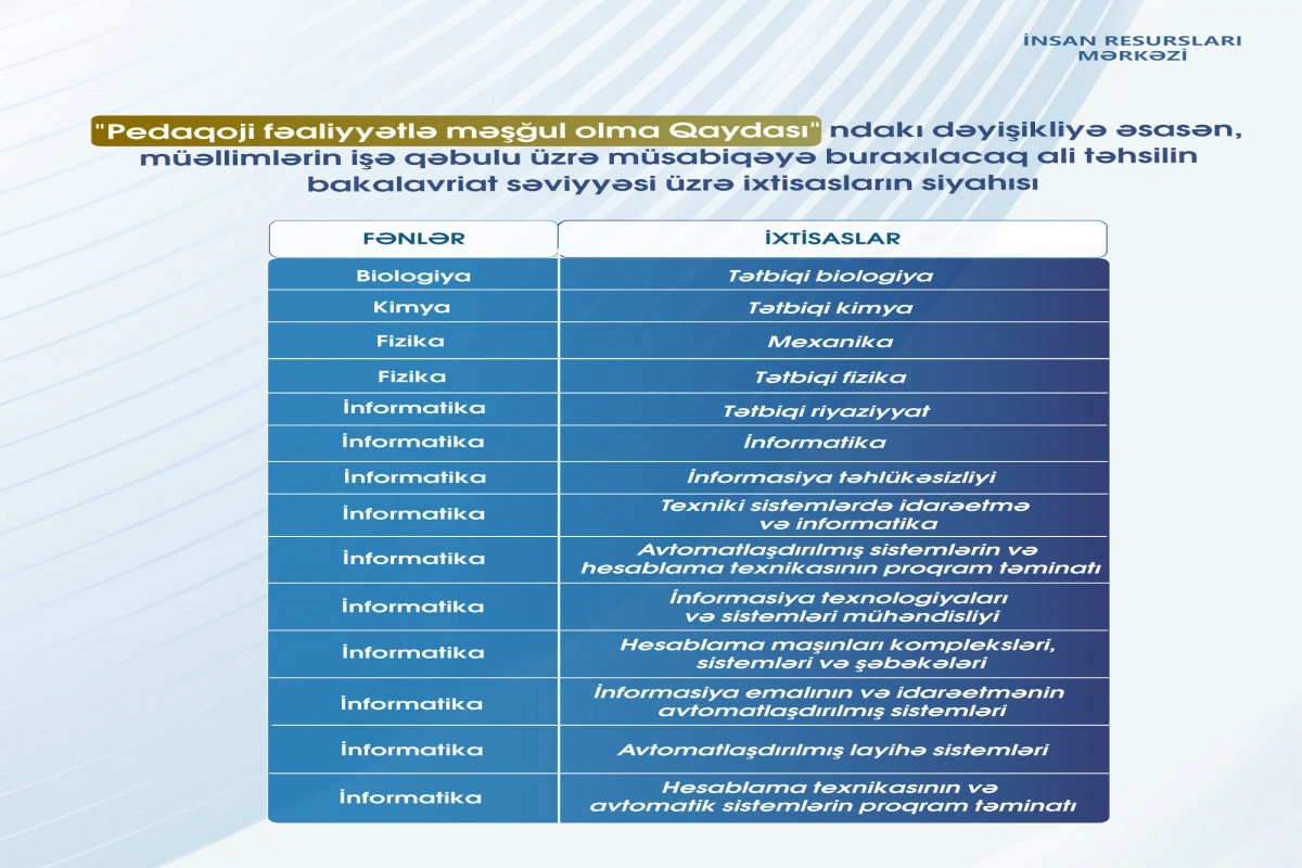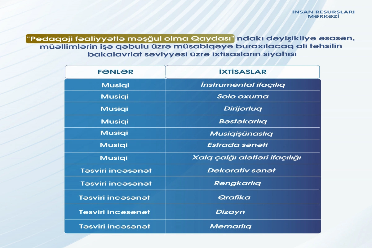 Bildirilib ki, hər il müsabiqəyə buraxılacaq ixtisasların siyahısı Elm və Təhsil Nazirliyi tərəfindən elan edilir. Siyahı “Pedaqoji fəaliyyətlə məşğul olma Qaydası”nın əlavəsində qeyd edilən ixtisaslara müvafiq olaraq müəyyənləşdirilir.