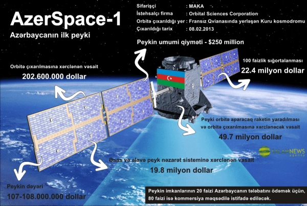 Azərbaycanın ilk telekommunikasiya peyki olan "Azerspace-1" 2013-cü ilin fevralın 8-də "Ariane-5" daşıyıcı raketi ilə orbitə buraxılıb. Əhatə dairəsi Avropa, Afrika, Mərkəzi Asiya, Yaxın Şərq, Qafqaz olan peykin imkanlarının 20 faizi Azərbaycanın tələbatını ödəmək, qalan 80 faizi isə kommersiya məqsədi daşıyır. Ölkə ərazisində keyfiyyətli televiziya və radio yayımı, sürətli internet xidmətləri təminatçısı peyklə bağlantıların təhlükəsizliyinə təminat verir. Dəyəri 233 milyon dollar olan peykin istismar müddəti ən azı 15 ildir. Azərbaycanın 2014-cü il iyunun 30-da orbitə göndərdiyi ikinci peyk isə "Azersky" adlı müşahidə peykidir. Dəyəri 157 milyon avro olan "Azersky" əsasən Azərbaycanın müdafiə və təhlükəsizliyinə xidmət edir. Sayca üçüncü, telekommunikasiya peykimizin ikincisi - "Azerspace-2" isə 2018-ci il sentyabrın 26-da Kuru kosmodromundan "Arianespace" şirkətinə məxsus "Ariane-5" daşıyıcı raketi ilə orbitə buraxılıb. Peykin əhatə dairəsi Avropa, Yaxın Şərq, Tropik Afrika, Mərkəzi və Cənubi Asiyadır. Məlumata görə, 190 milyon dollara başa gələn "Azerspace-2"nin istismar müddəti 20 ildir. Orbitə buraxılan hər üç peykin hər cəhətdən çox böyük əhəmiyyəti var. Bu, digər tərəfdən Azərbaycanın kosmik sənayesində öz mövqelərini möhkəmləndirməklə, dövlətimizin gücünü göstərir. Peyklər ölkəmizin informasiya təhlükəsizliyini təmin edir. Bundan əlavə bu vasitə ilə Azərbaycan telekanalları dünyaya öz verilişlərini təqdim edə bilirlər".